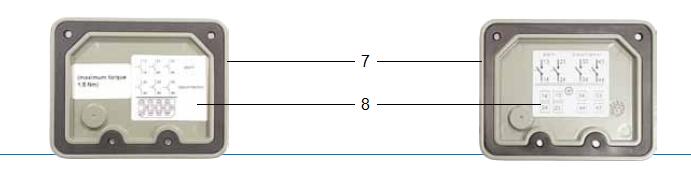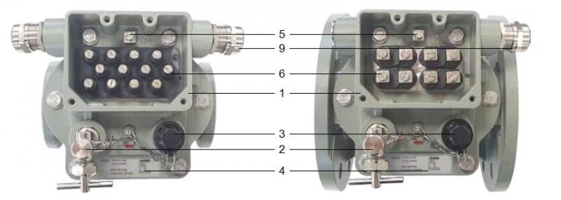 頂蓋是由耐氣候變化的鑄鋁合金制成,表層已涂色. 頂蓋部件上部有一個接線盒(圖4中1),在接線盒前面有一個放氣閥(圖4中2)和一個用悶蓋螺母(圖4中3)覆蓋的測試按鈕,同時上面還附有一個測試按鈕操作說明標(biāo)牌(圖4中4). 接線盒中除了有一個接地點(圖4中5)外,頂蓋底板內(nèi)還裝有電力引線端子(圖4中6). 通過電力引線端子的數(shù)量可以決定涉及干簧管類型與數(shù)量的開關(guān)系統(tǒng)的布線配置.